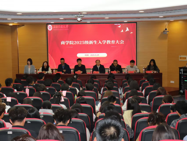 2025年9月24日,商学院在行知楼230教室隆重举行2025级新生入学教育大会。商学院党委书记武全、党委副书记姚占魁、副院长张国卿、副院长李向荣、团委书记李箐、团委副书记李婷、优秀教师王健栋、优秀教师姚佳琪及2025级全体新生参加。