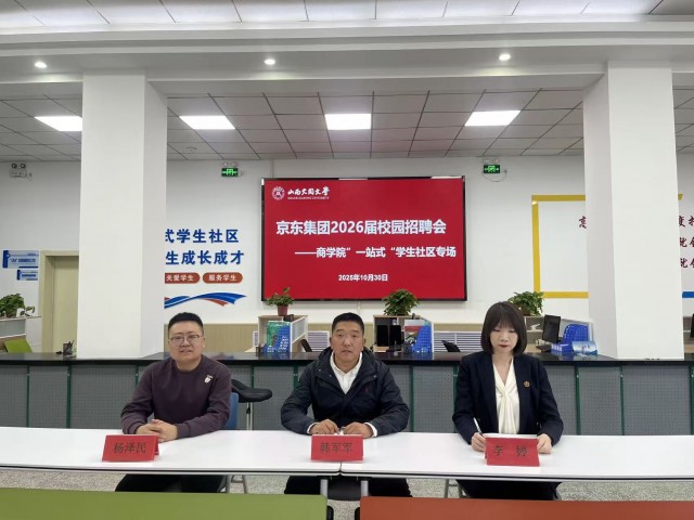 按照学校“一核、多点、星罗棋布”的建设思路,强化“一站式”学生社区就业育人阵地的功能,2025年10月30日,山西大同大学商学院在学校“一站式”学生社区举办京东集团2026届秋季专场招聘会。京东集团股份有限公司片区运营经理韩军军、人力资源业务合作伙伴杨泽民和商学院团委副书记及就业联系人李婷参加活动。