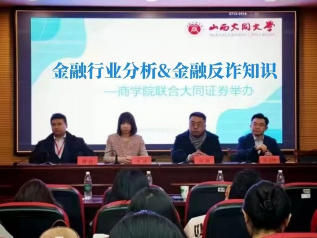 党的二十届四中全会对“十五五”时期加快建设金融强国作出战略部署,对于做好新时代新征程金融工作具有重大而深远的指导意义。为了深入学习贯彻党的二十届四中全会精神,助力学生夯实金融行业知识基础、筑牢校园金融反诈防线,2025年11月26日下午,山西大同大学商学院联合大同证券有限责任公司在行知楼230会议室举办“金融行业分析&金融反诈知识”专题讲座,本次讲座面向商学院大一至大四全体学生。大同证券新平旺营业部总经理刘刚,财富中心负责人周伟,团队长朱文钊和商学院团委副书记兼就业联系人李婷出席此次活动。