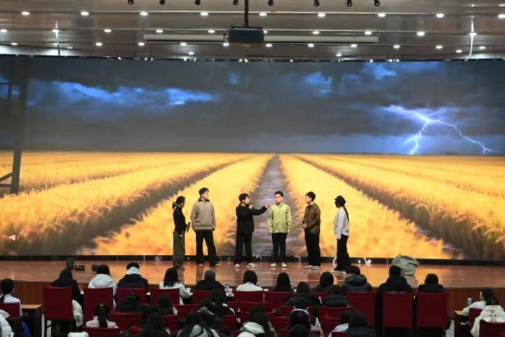 随后,展演精彩启幕,同学们倾情演绎经典。《焦裕禄》片段质朴深情,尽现人民公仆的崇高风范;《江姐》选段刚毅铿锵,传递革命信仰力量;《永不消逝的声音》朗诵激昂真挚,讴歌不朽的精神力量;改编版《茶馆》生动勾勒出时代众生相,意蕴悠长;《简·爱》片段细腻展现了对独立、尊严与爱情的执着追求。表演结束后,商学院党委副书记姚占魁和文学院团委书记冀敏在点评中高度评价了各参演团队的精彩演出。他们指出,同学们以真挚的表演和鲜活的舞台表达,深刻诠释了经典剧目中所蕴含的青春与信仰的力量。
