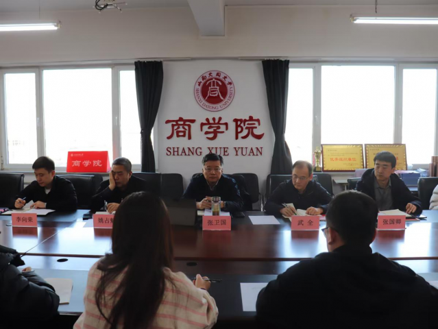 2026年1月5日下午,校党委副书记张卫国莅临商学院宣讲党的二十届四中全会精神并召开调研座谈会。商学院班子成员、科级以上干部、党支部书记、系主任、专职组织员、专职辅导员、青年博士教师代表、党员代表和学生代表参加会议。会议由商学院党委书记武全主持。